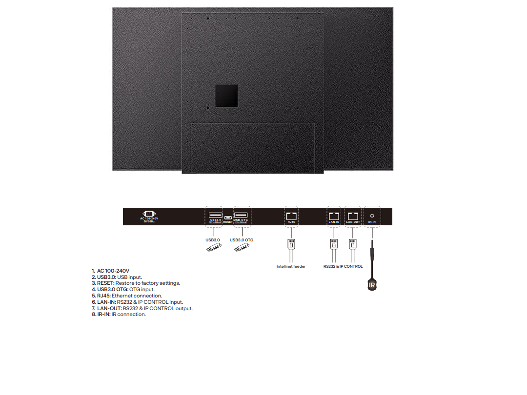 • Wired: 2× USB (USB 3.0 ×1, USB 3.0 OTG ×1), 1× RJ45, LAN In ×1, LAN Out ×1, IR In ×1.