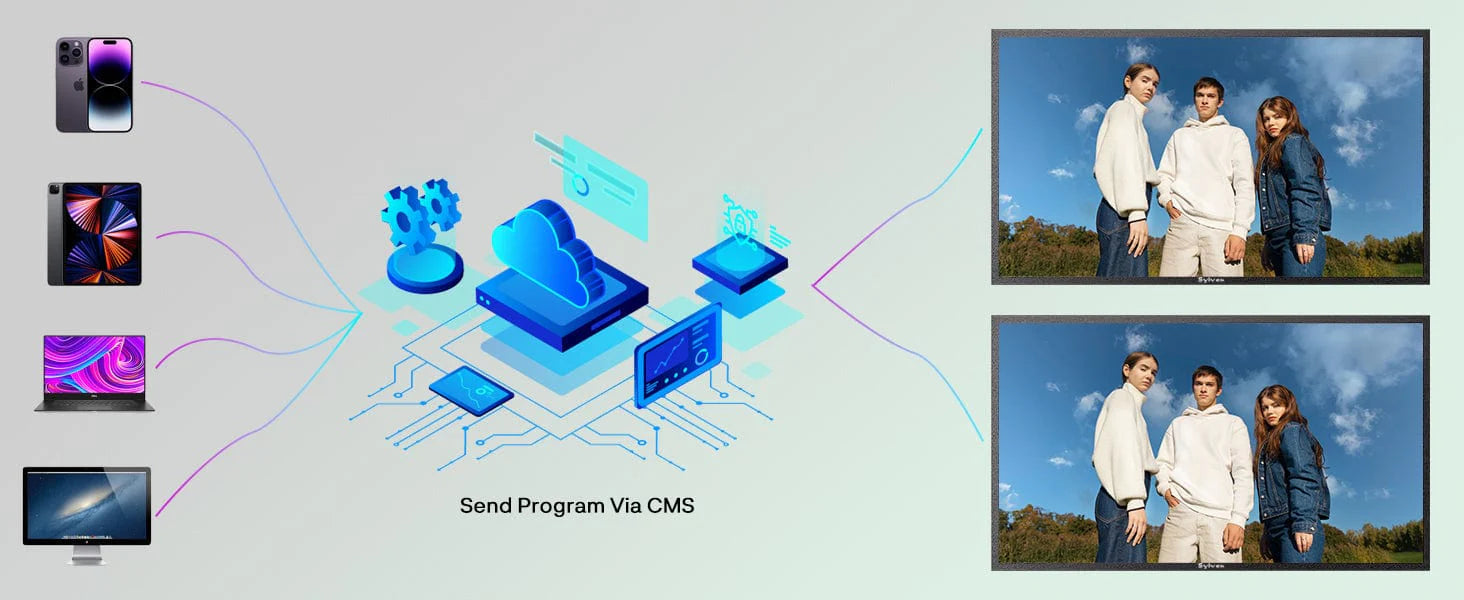 • Cloud-based Content Management System (CMS) with RS-232 remote and local monitoring.