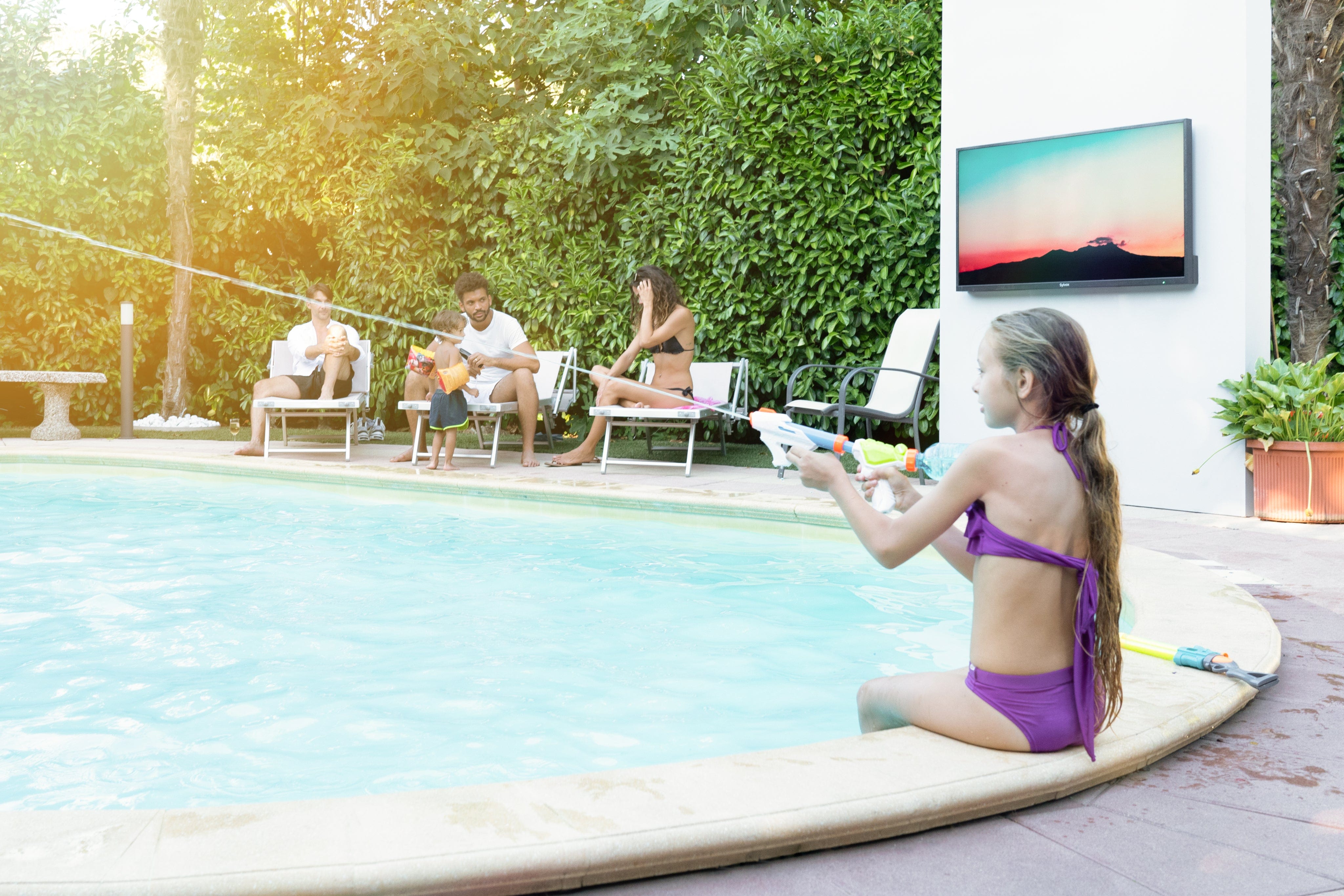 Pool/Pool Pro/Pool Pro QLED Series, with 2000 nits of brightness, is ideal for fully sunny outdoor spaces and active areas like poolside and outdoor seating. It features heat-resistant screens and is a commercial-grade display, 5-7 times brighter than indoor TVs.