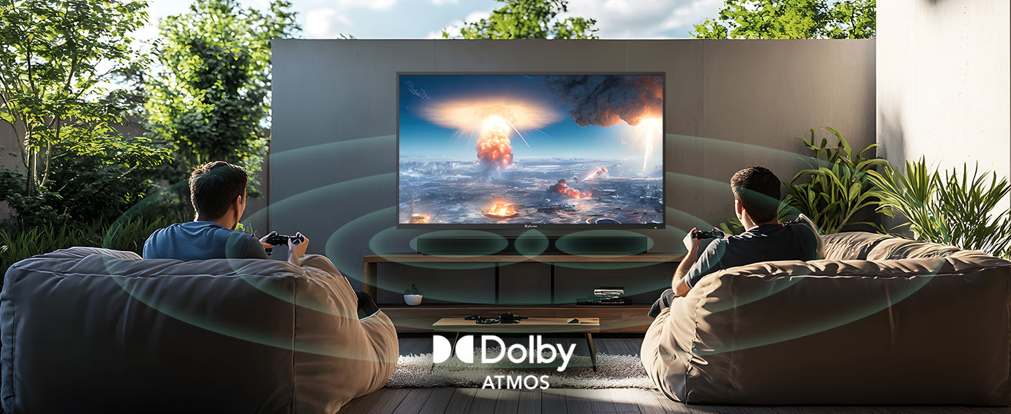 75 inch outdoor gaming TV with soundbar, weatherproof television for patio, backyard or garden entertainment