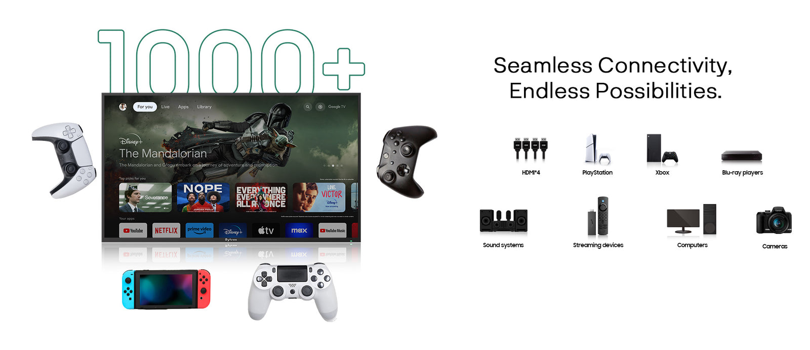 • Versatile Connectivity – Dual HDMI 2.1, USB, Optical Out, Wi-Fi and Bluetooth for gaming consoles, streaming devices, and more.